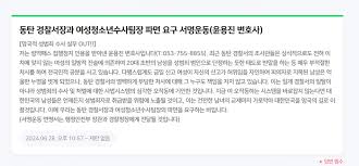 윤용진 변호사는 화성 동탄경찰서장과 수사관에 대한 파면을 요구하는 인터넷 서명운동을 벌이고 있습니다. 변호사는 경찰의 일방적인 수사 과정과 여성 진술만 의존한 조사가 심각한 문제점이라고 지적했습니다.